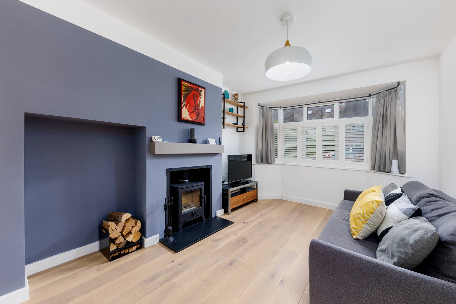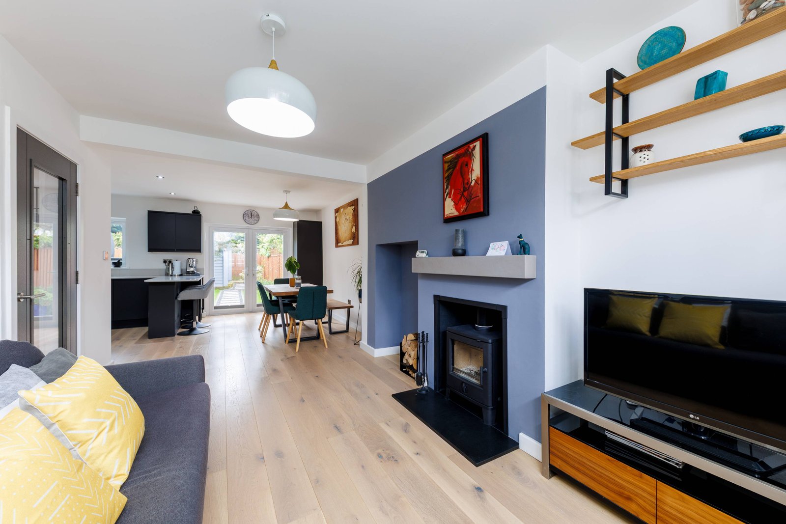 The reception room features a delightful wood-burning stove, perfect for cosy evenings, and window shutters. The open-plan space is a highlight of the home, providing a fantastic space for family gatherings and entertaining guests.